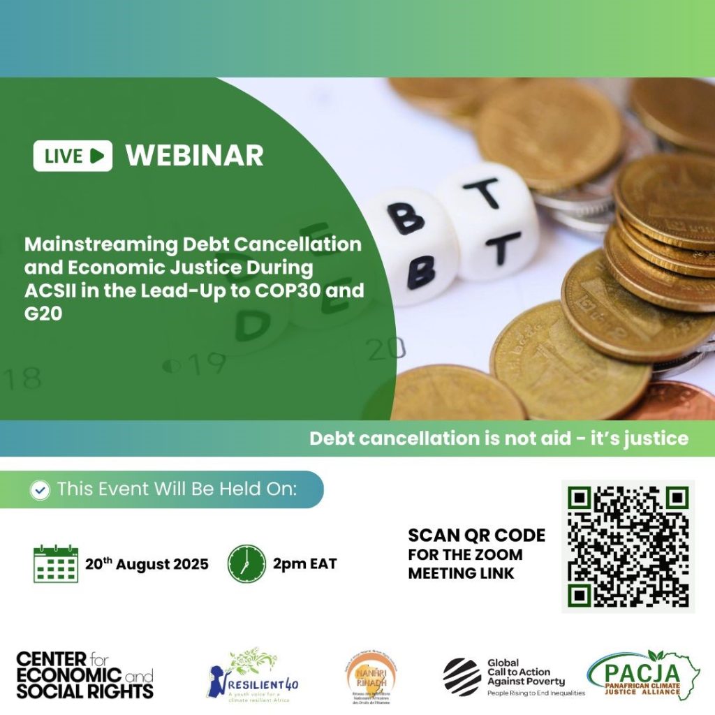 To reframe Africa’s economic and climate diplomacy narrative ahead of the Second Africa Climate Summit (ACS-II), COP30 and the G20, Resilient40 in collaboration with PACJA, NANHRI, ACJ, CESR, GCAP and AACJ, are convening a strategic pre-ACS-II webinar titled “Mainstreaming Debt Cancellation and Economic Justice During ACS-II in the Lead-up to COP30 and G20”.